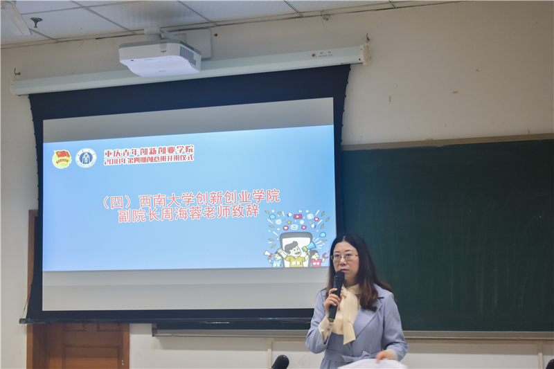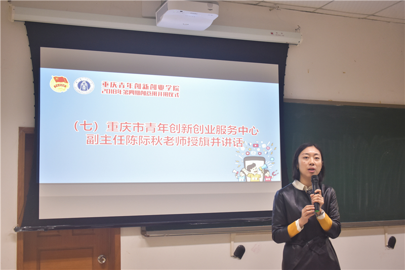 重庆市青年创新创业服务中心副主任陈际秋授旗并讲话,她希望青年员工能传承发扬创新创业精神,学习要“实”,努力使自己具备创新创业的理论知识和实践能力;交流要“深”,与授课老师和同班同学都展开充分深入的交流。