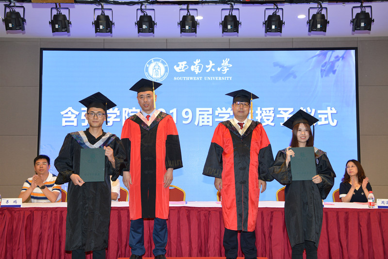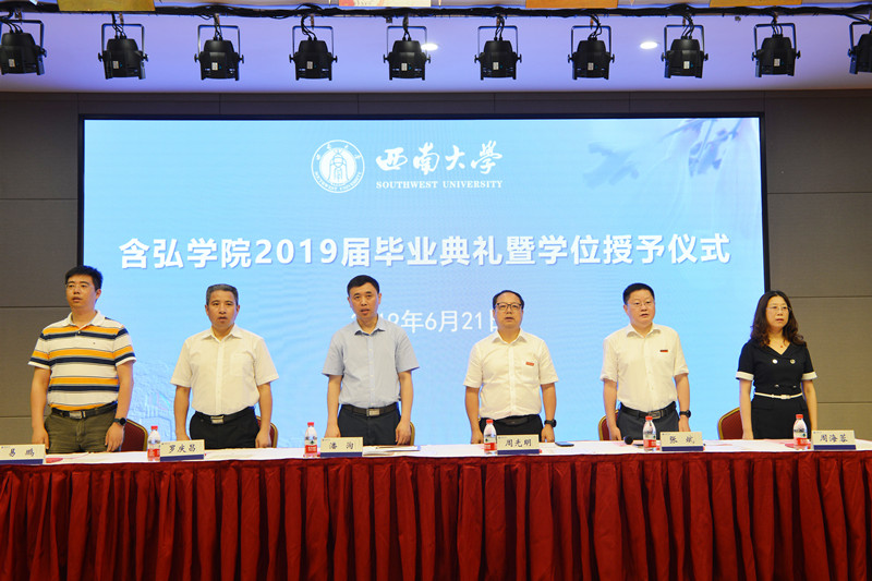在《含弘之歌》的歌声中,党委副书记、教授、博士生导师潘洵,董事长助理、教授、博士生导师周光明为获得学位的2019届含弘学院毕业生逐一授予学位。