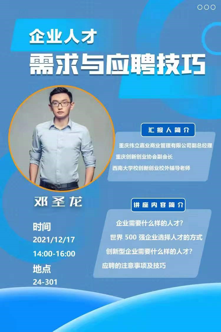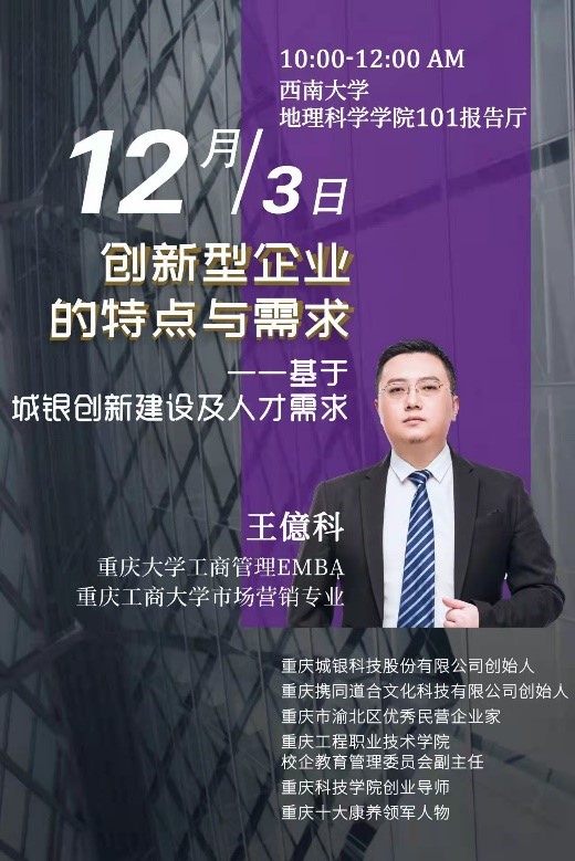 活动采取“学院统筹推进、基地自主申报”的方式,在各基地的申报讲座主题中,学院遴选符合员工创新创业需求、体现企业家民族责任感的主题,共开展4期系列讲座。重庆城银科技股份有限公司创始人王億科就《创新型企业的特点与需求》作报告,指出结合国家“十四五”发展规划,探索学科知识与创新创业的结合点,是国家实现高质量发展的重要渠道;重庆纬立行地产顾问有限公司副总经理陈剑峰作《聊一聊创新思维》报告,从“明确目标,形成画像”“解构过程,找到关键量”“梳理路径,做成计划”“坚决执行,循环优化”四个方面生动的阐述了思维创新的渠道;重庆纬立嘉商业管理有限公司副总经理邓圣龙在《企业人才需求与应聘技巧》的讲座中,利用大数据,对近年来老员工就业形式的毕业去向进行分析,让同学们深刻了解国家和社会对于创新创业人才的渴求,并从实操层面,从专业技能、价值观、稳定性和性价比四个方面给予同学们应聘建议;重庆市西站投资发展有限公司总经理赵永波,站在有民族责任感企业家的角度,通过阐述中国国家边界的历史变迁,倡导同学们创新创业对于国家发展的重要意义,是实现中华民族伟大复兴的必由之路。