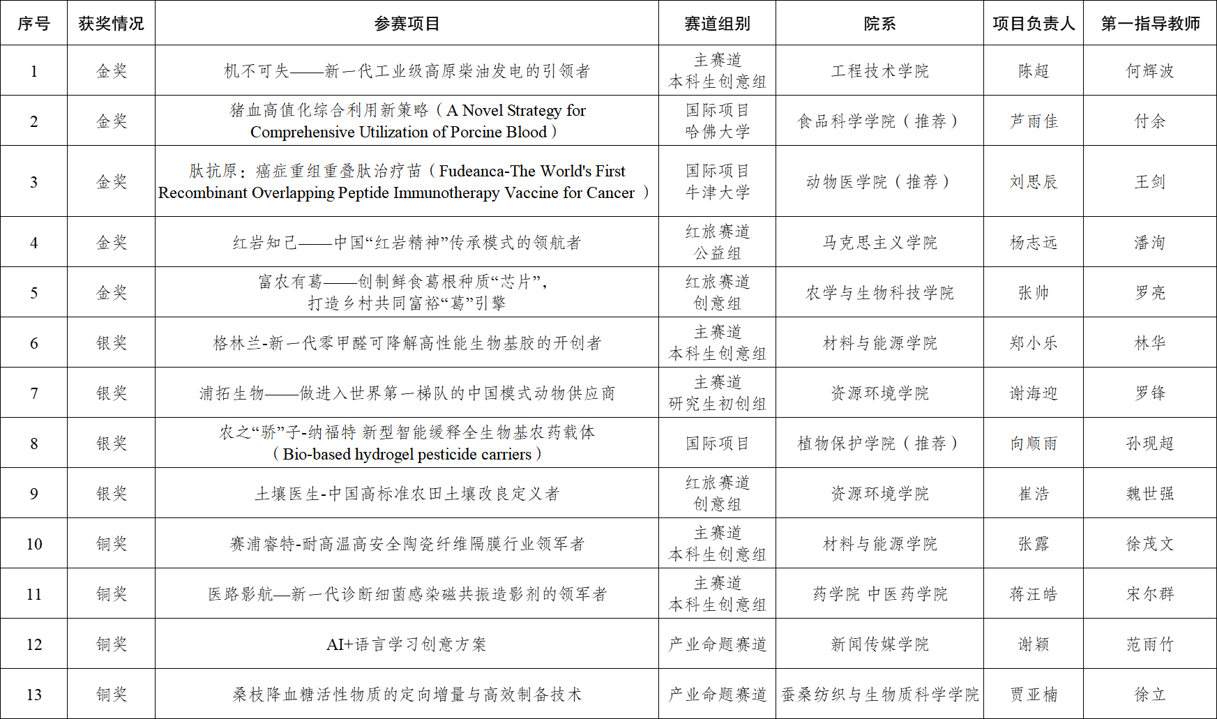 本次学校共13个项目入围全国总决赛,经过网评、会评,9个项目进入全国总决赛现场比赛,网评通过率近70%,远高于全国30%的平均水平。各项目团队在分组、抽签极为不利的严峻情势下,在各大高水平项目中崭露头角,展现西大学子风采,展示学校育人成果,有效提升学校影响力。红旅公益组“红岩知己”项目作为9年大赛中首个红色精神项目摘得金奖;本科生创意组“机不可失”项目再续本科生组辉煌,在强劲对手下表现优异取得金奖;红旅创意组“富农有葛”项目和国际项目“Fudeanca”项目均在抽签小组第一的情况下披荆斩棘斩获金奖;国际项目“Porcine Blood”项目负责人为学校优秀毕业生,现就读哈佛大学,不负众望获得金奖。