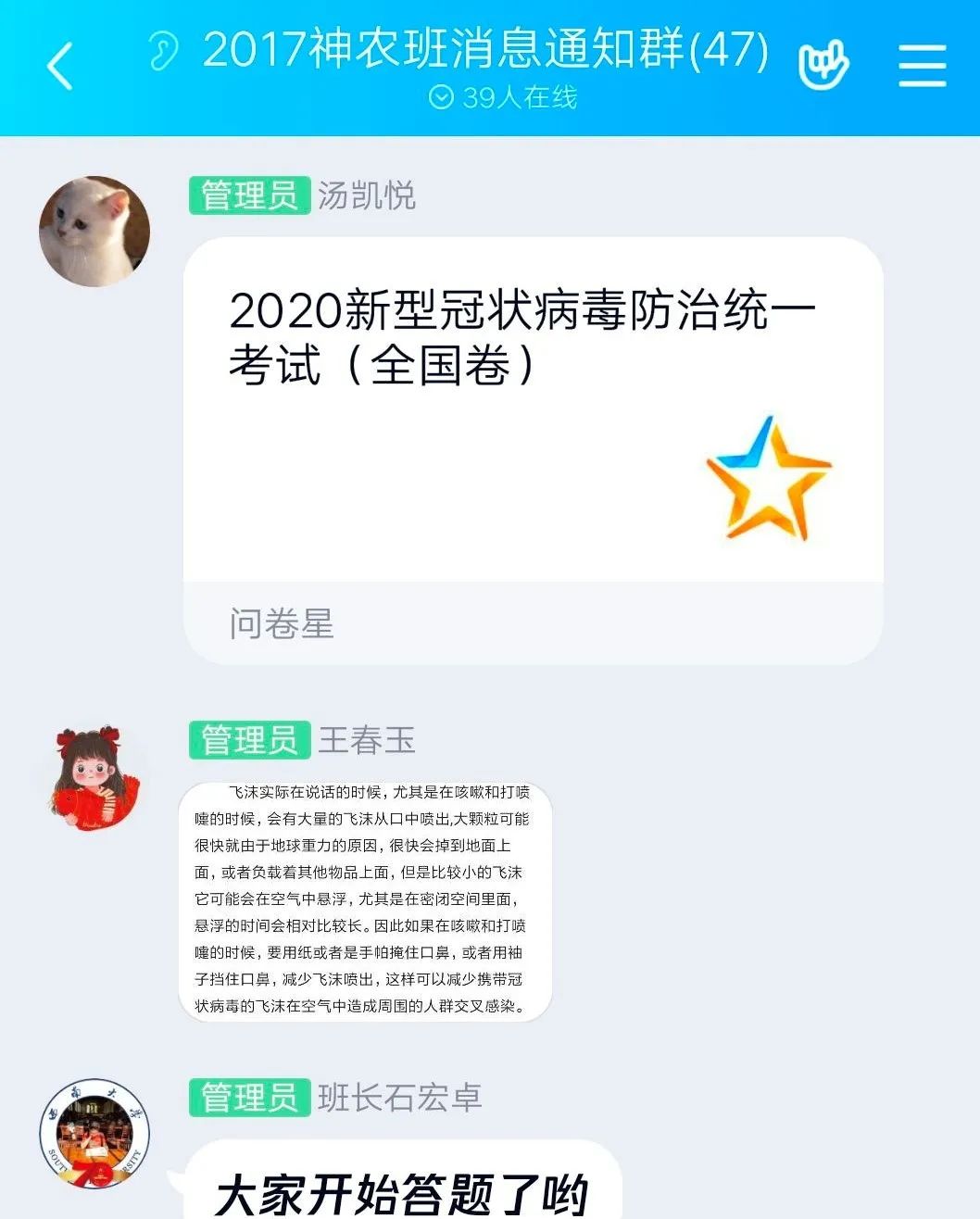 在理论学习基础上,各班在各班团支书的组织下,进行了有关这次疫情和有关雷锋精神的线上知识问答活动。在这个过程中,对疫情防控的相关国家政策,防护措施和抗疫知识进行检测。其中19级袁隆平班和吴宓班设置了抗疫知识和雷锋精神内涵的问题抢答环节,17级神农班的同学设计了知识问卷,并对此次团日活动每位员工的各种表现进行了细致的评分评比。