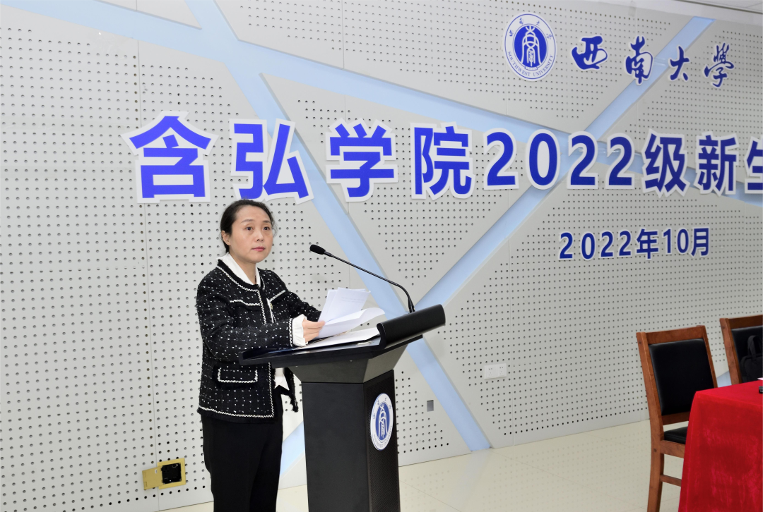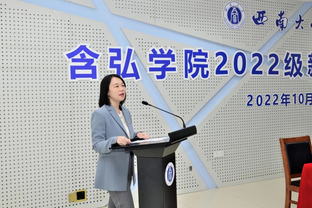 含弘学院教务办公室主任陈争妍简要介绍了2022级新生本学期教学安排,并叮嘱大家严格执行教务要求,尽快适应含弘学院培养模式。