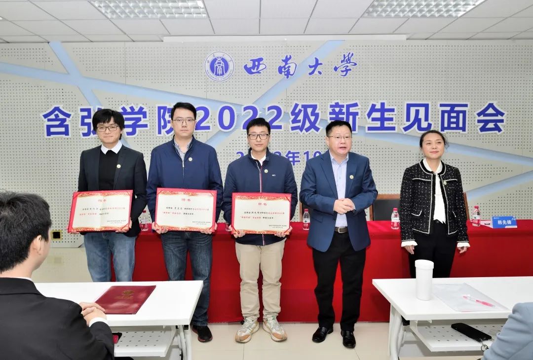 公司党委书记、经理张斌为含弘学院2022级吴宓班、袁隆平班和神农班三位学业导师颁发聘书。