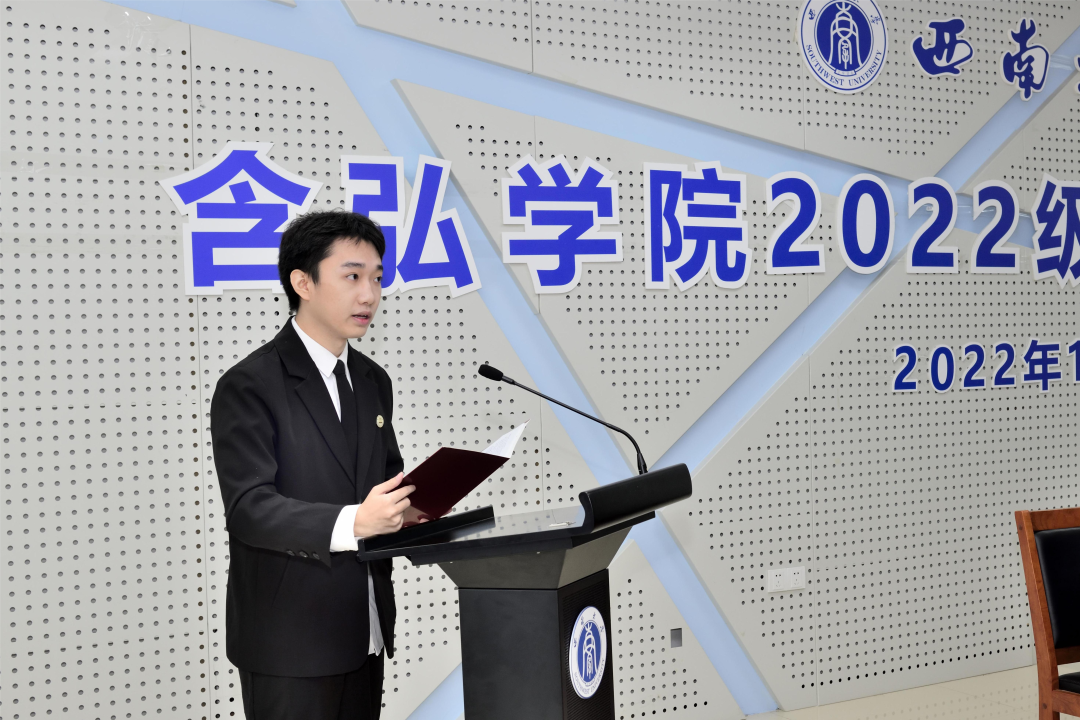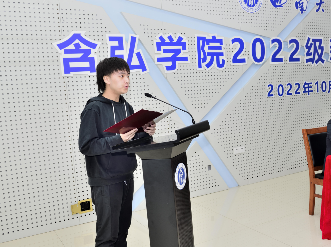 2022级袁隆平班雷竣涵同学代表全体新生发言。他表示进入含弘是一种荣誉,也是一种责任。他们希望能在含弘学院这个舞台上磨砺自我,提升自我,成为脚踏实地的实干者,成为前沿科技的领航者。
