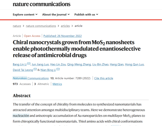 近期,含弘学院应用化学专业2019级本科生骆俊江在化学化工学院李念兵教授、罗红群教授、李帮林副教授团队带领下,在手性纳米材料合成领域取得研究进展,并作为第二作者,以“Chiral nanocrtals grown from MoS2 nanosheets enable photothermally modulated enantioselective release of antimicrobial drugs”为题在国际知名学术期刊Nature Communications (Nat. Commun., 2022, 13, 7289)上发表学术论文。