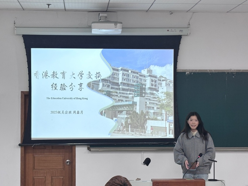 赴香港教育大学交换的周鑫月向同学们分享交换项目信息的来源与自己成功申请公费交换项目的经验。她提醒同学们明确自身需求,根据未来规划与专业选择来挑选适合自己的交换项目。她鼓励同学们选择多个领域的专业课,抓住机会、大胆探索。