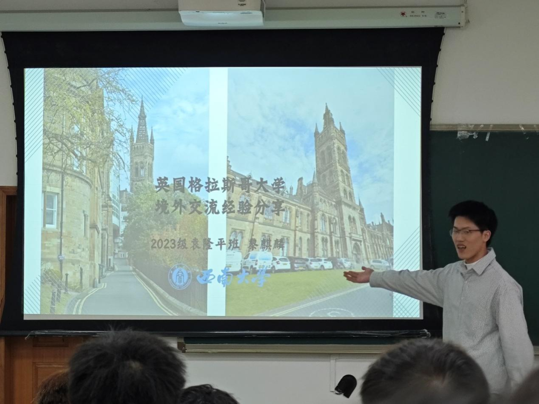 赴英国格拉斯哥大学交换的黎麒麟介绍了这所大学的优势学科与课程安排,分享了他独特的学习感受。在体验了国外自主性极强的学习模式后,黎麒麟鼓励同学们在交流交换过程中大胆试错,勇敢弥补不足,坚定克服困难。
