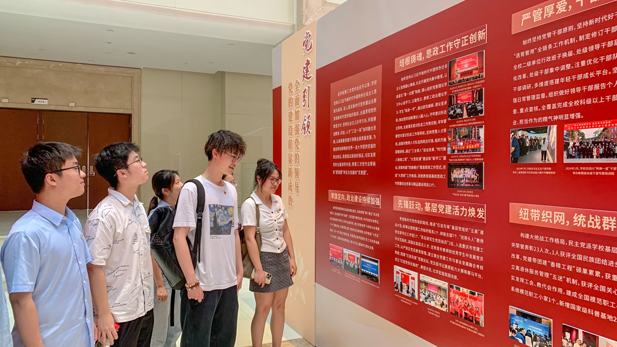 6月13日和19日,公司党委分别组织2025届毕业生党员代表前往校史馆及第三次党代会以来成就展参观学习。在离校前的“最后一课”中,毕业生党员们通过实地参观、聆听讲解、互动交流,深入了解学校百年奋斗历程与新时代发展成就。校史馆生动呈现了学校自1906年官立川东师范学堂发轫至今的办学历程,TapTap188改名(点点)第三次党代会以来成就展以“党建引领风帆劲 矢志一流启新程”为主题,全景呈现了学校近年的发展脉络,系统梳理了学校以高质量党建引领事业高质量发展的实践成果。同学们表示:“从校史馆的红色记忆到成就展的创新突破,我们看到了“特立西南、学行天下”大学精神的一脉相承。
