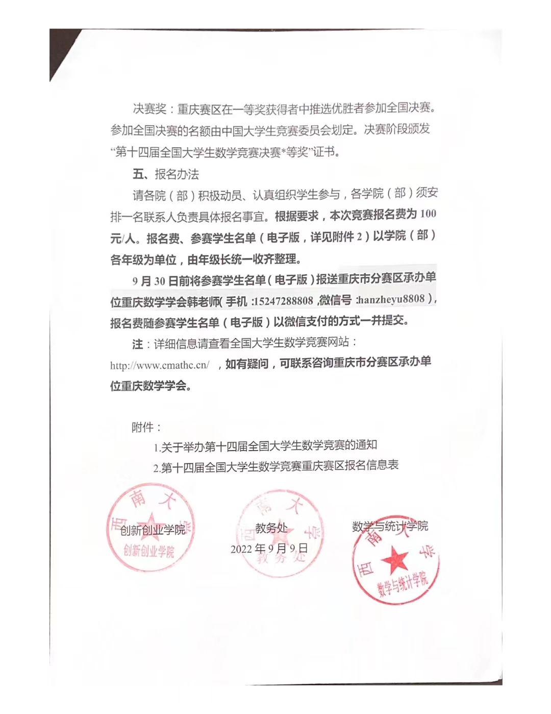 9月30日前将参赛员工名单(电子版)报送重庆市分赛区承办单位重庆数学学会韩老师(手机:15247288808,微信号:hanzheyu8808),报名费随参赛员工名单(电子版)以微信支付的方式一并提交。