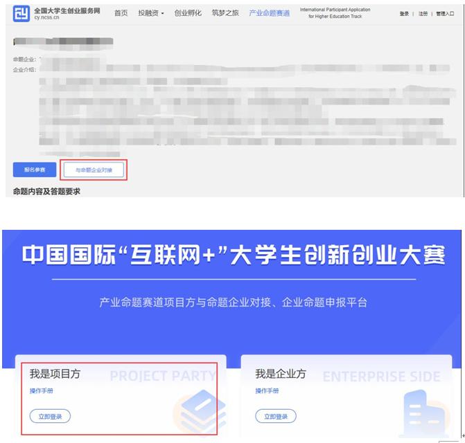 点击“与命题企业对接”,跳转至【产业命题赛道命题企业对接、企业命题申报平台】,注册登录后与命题企业对接咨询,进一步了解命题具体解答要求、获取企业支持等。