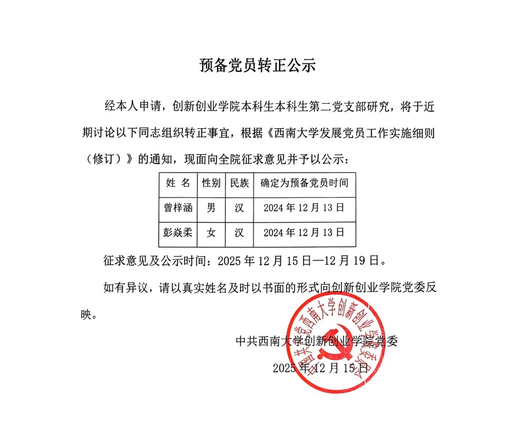 关于曾梓涵、彭焱柔同志的预备党员转正公示