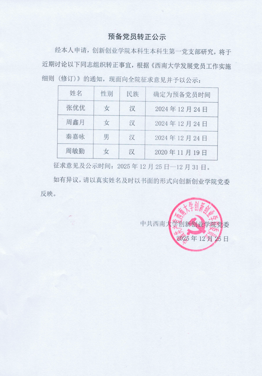 关于张优优、周鑫月、秦嘉咏、周敏勤同志的预备党员转正公示