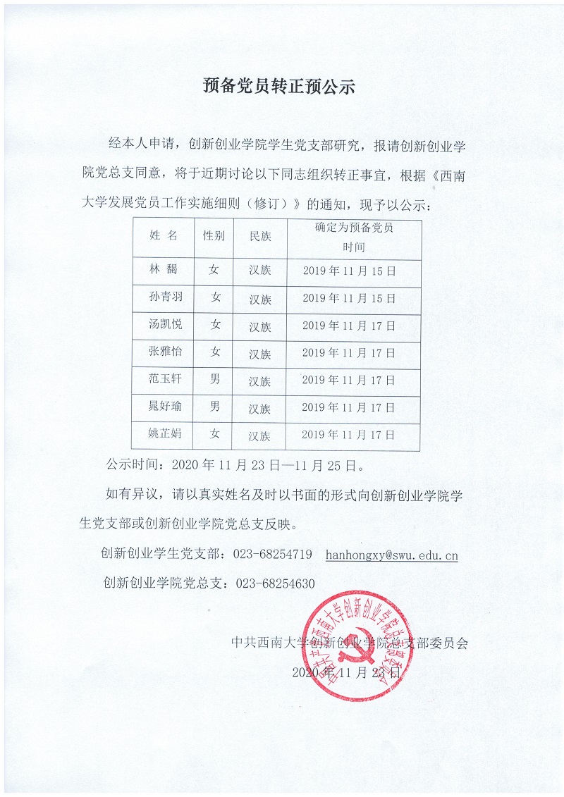 预备党员转正预公示2020年11月