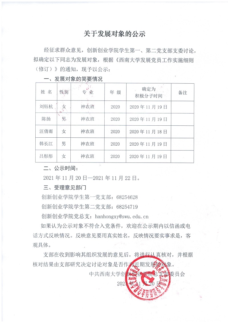 关于发展对象的公示2021年11月份第二批