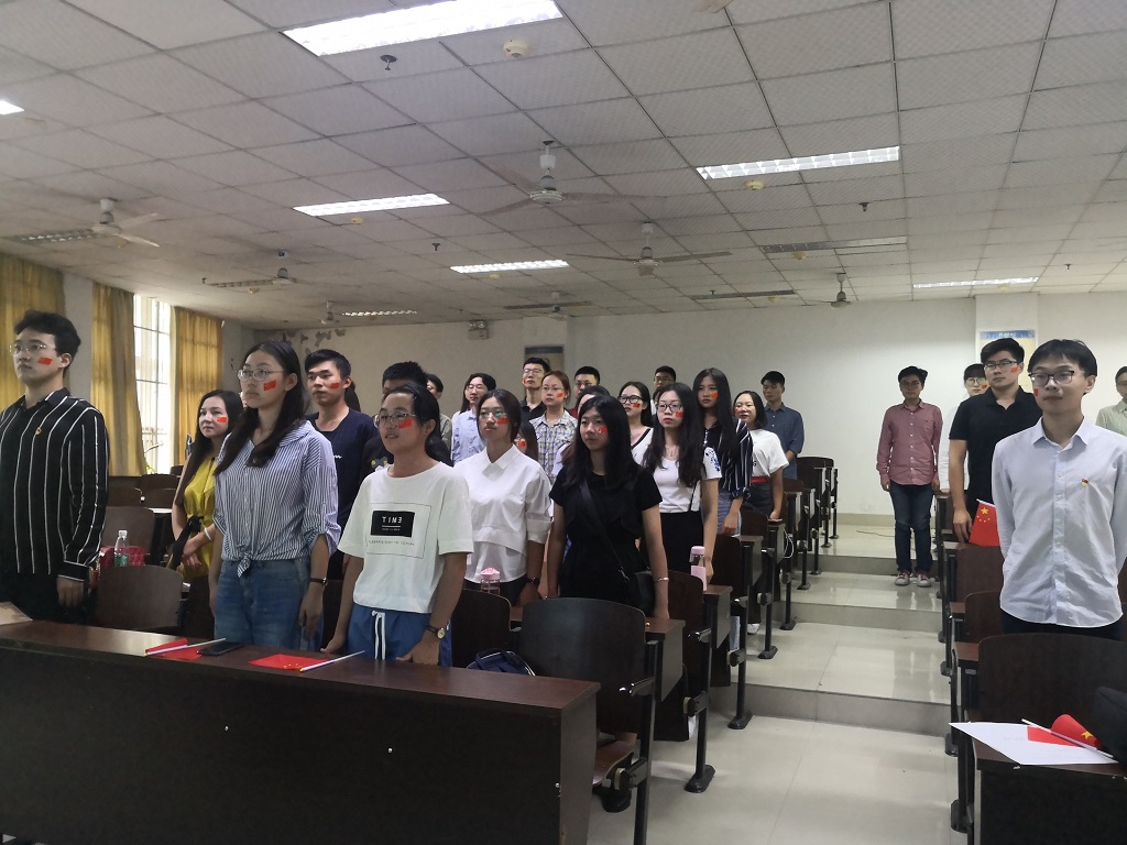 仪式正式开始前,支部书记为在场所有同学上了一堂党课。在党课中他与大家分享了自己求学的经历,讲述在他眼中祖国在进入21世纪的十几年间发生的巨大变化。他指出中国之所以能够在70年间取得如此耀眼的成绩,主要是由于两点:一是我们始终坚持党的领导,二是中国人民勤劳肯干。他强调作为当代老员工,要增强“四个意识”,坚定“四个自信”,善于利用学习强国等平台,回顾党的光荣历史和革命传统,了解党,热爱党,宣传党,不断涵养党性,坚定政治信念。在党课中,袁凯琴、赵雪程、温馨、石宏卓四位同学和辅导员肖雨琳老师依次交流了自己眼中祖国的变化。袁凯琴、赵雪程和石宏卓三位同学讲述了祖国在交通和生态方面发生巨大的变化,从以前的绿皮火车发展成如今的高铁四通八达,从以前的土路发展成如今的高速公路,从以前的雾霾不断到如今的逐步改善。温馨同学则分享了她看到的祖国在文化方面的进步,对比过去,新时代的青年,不断增强对传统文化的了解,在此基础上不断增强文化自信并善于传播祖国的文化。肖雨琳老师从衣、食、住、行、科技、生态、教育、人民素质等多个方面全面概述了祖国的变化。这些交流与分享更进一步提升了大家对祖国的认同感和自豪感。