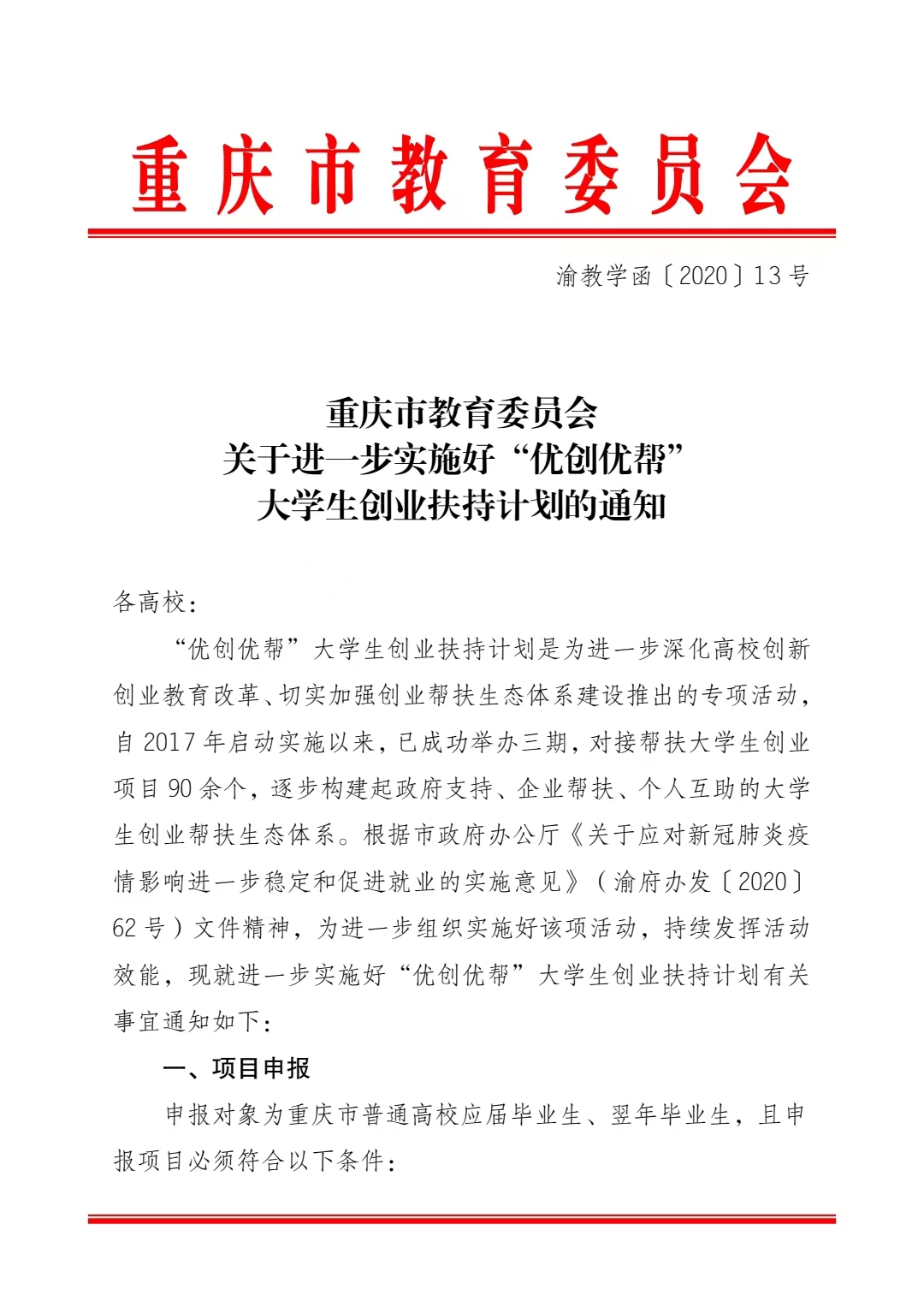重庆市教委关于进一步实施好“优创优帮”老员工创业扶持计划的通知(渝教学函〔2020〕13号).pdf