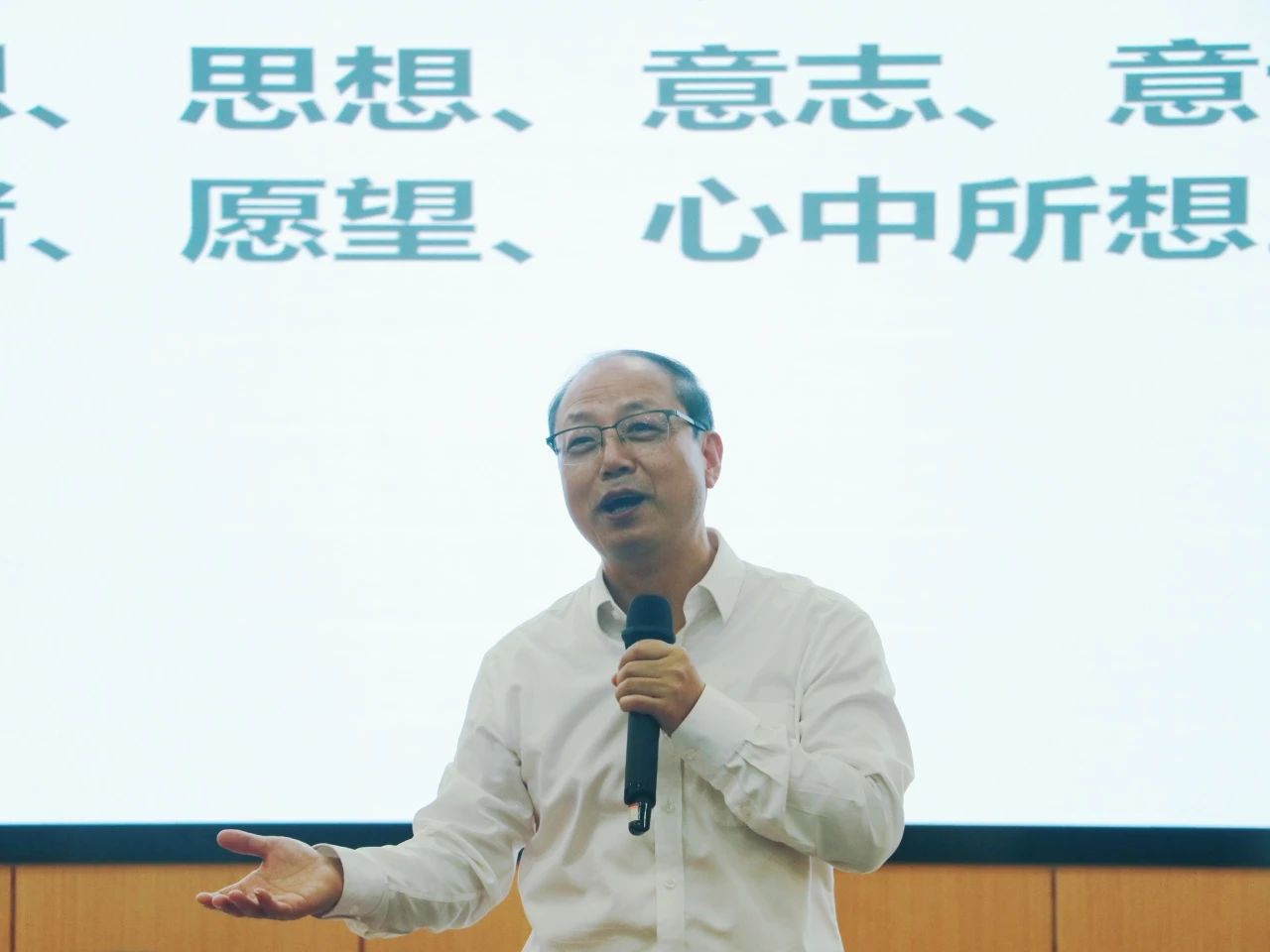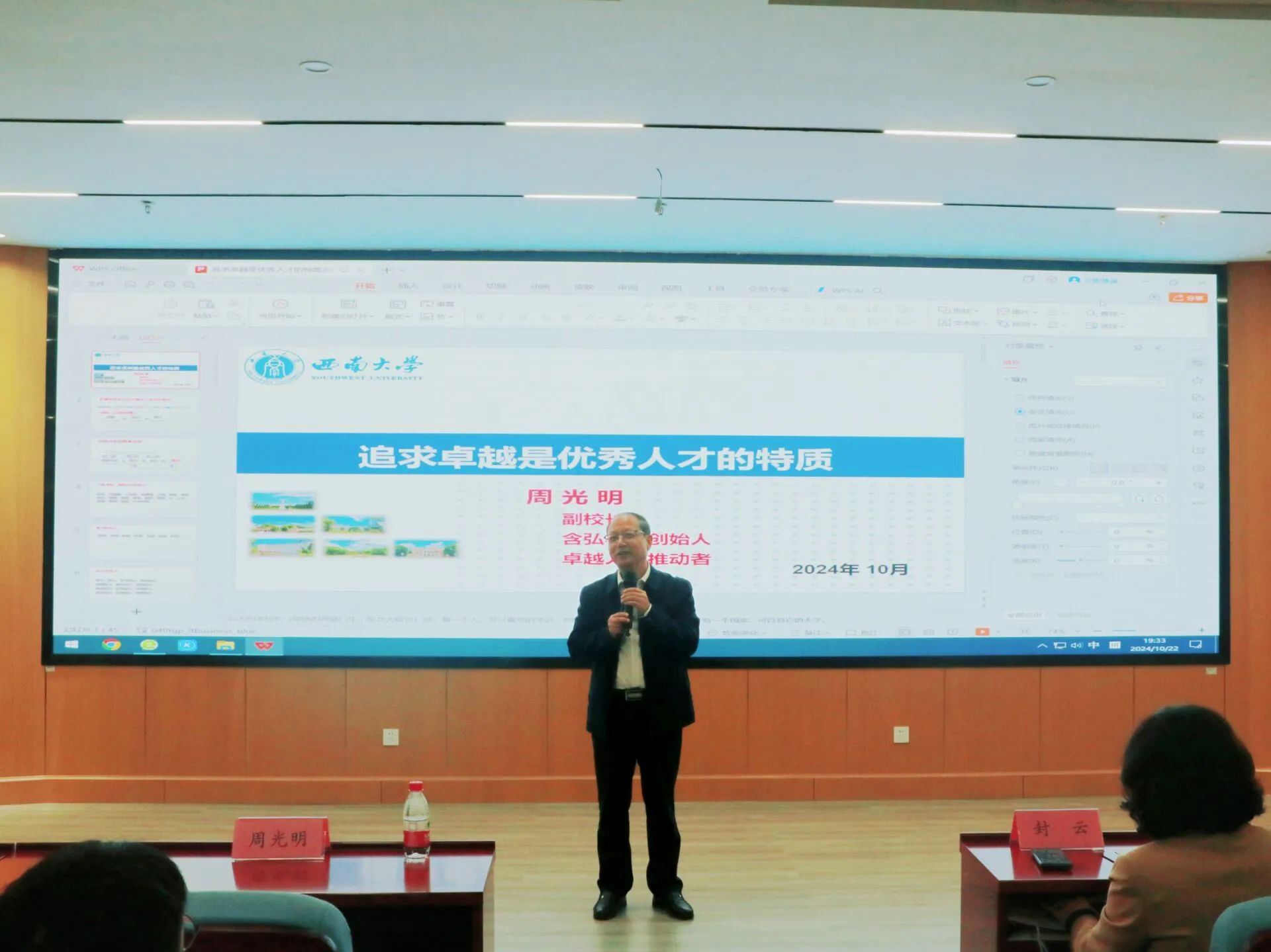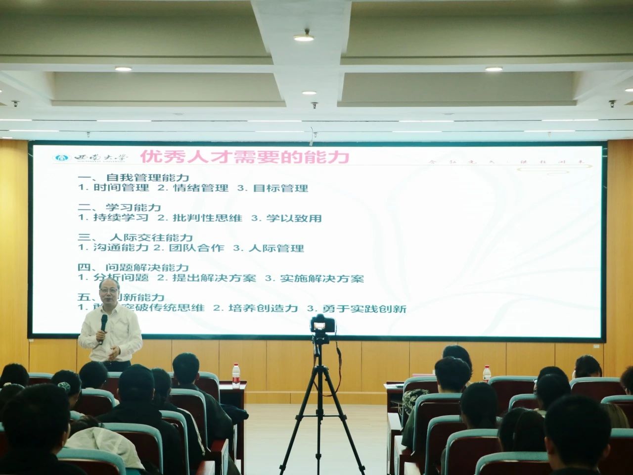 周光明从成功方程式引入如何实现成功,他结合自身的经历分析了思维方式、不懈努力与自身能力是实现成功的三要素,并着重引导了员工们的荣誉观;他强调在大学学习中目标的必要性,从基础、方法、追求、保障、目标等方面向同学们介绍了老员工成长成才的必备条件,向与会的同学提出了含弘学子十八会的要求;他总结了拔尖创新人才需要具备的五项能力:自我管理、学习能力、人际交往、问题解决及开拓创新,并逐一分析了如何培养此五项能力;他特别重视同学们的身心健康,强调强大的内心能产生巨大的内驱力,健康的身体是学习生活的基本保障,这两者是成为拔尖创新人才的基础。