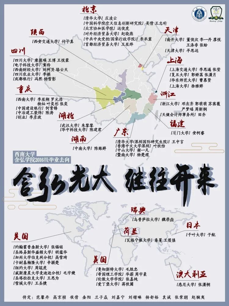 四年的初心坚守,自强不息,四年的风雨兼程,艰苦奋斗,终于在这个夏天画上了圆满的句号,含弘学子再创辉煌。在2020届的80名毕业生中,其中21人选择赴美国,英国,澳大利亚,荷兰、瑞典、日本等地继续学习,44人选择在国内高校或科研机构继续深造,另有5人在银行、国有大型企业等就业,1人自主创业。