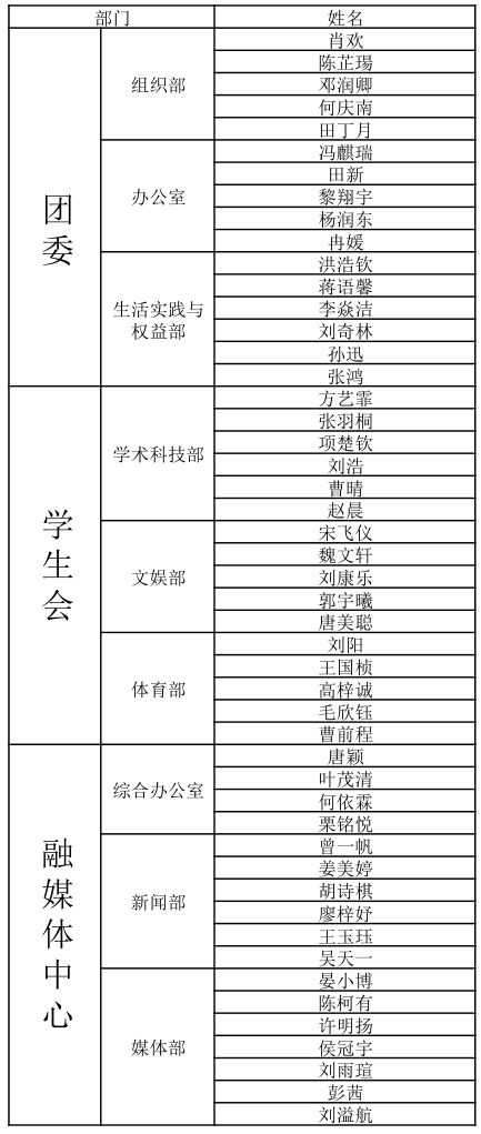 经过团委员工会和融媒体中心代表们的筛选并报学院审批后,最终确定以下同学进入团委员工会以及融媒体中心。