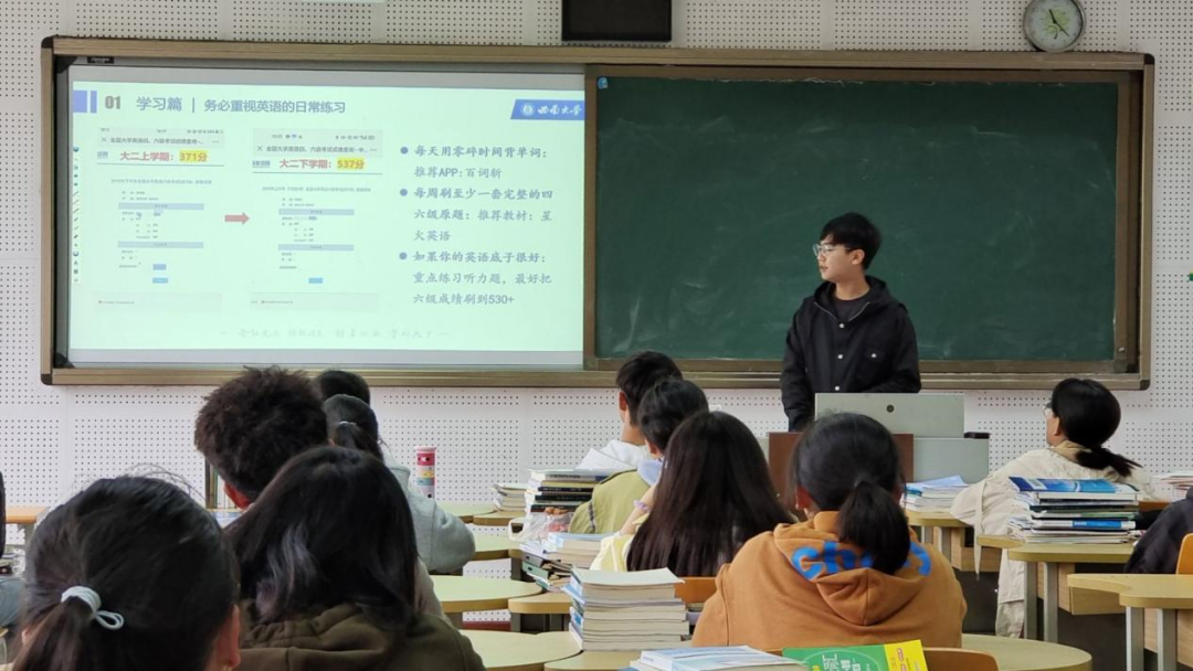 学习上,他认为GPA和学业排名是综合成绩最重要的基础。他建议同学们认真完成老师布置的作业,采用思维导图的方式对已学的知识进行巩固。其次要重视英语的日常练习,每天花零碎的时间记忆单词,每周固定练习四六级真题,保持自己的英语语感。