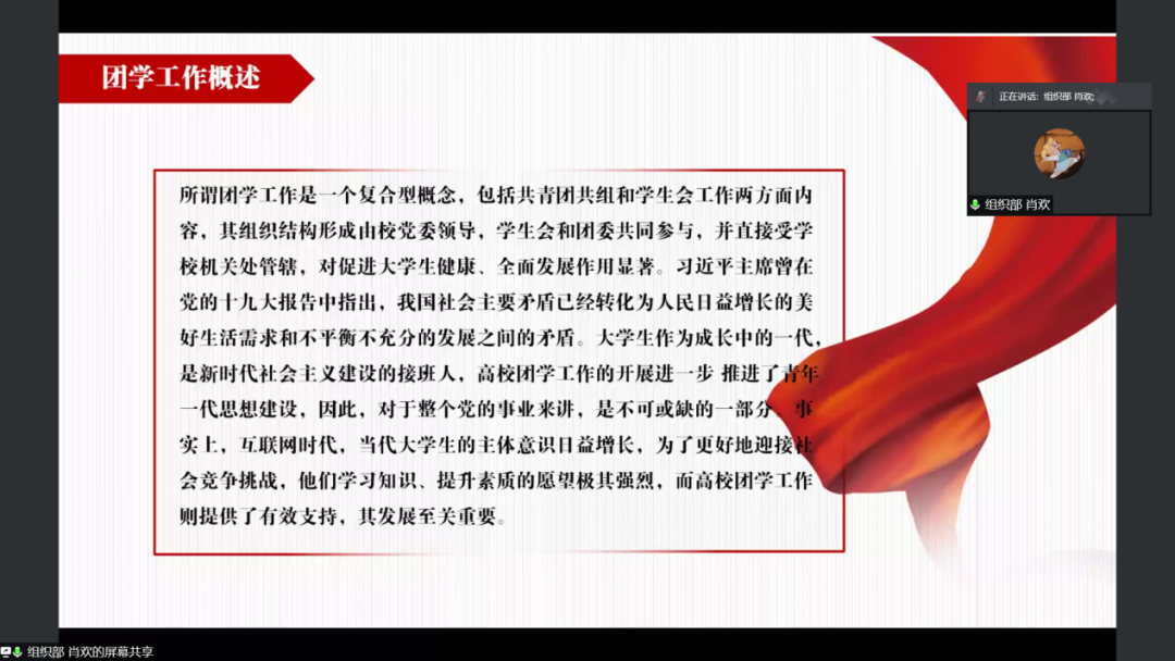 组织部工作人员肖欢同学就防范化解涉团学领域风险专题进行分享。讲解了团学领域存在的三种风险及其表现形式:形式主义泛滥、创新表现不足、内部凝聚力差。提出了防范化解风险四项对策:要重视思想引导、规范管理制度、加强和谐建设、引入先进科技,充分发挥二级学院团委员工会在参与学校管理和构建和谐校园中的作用。