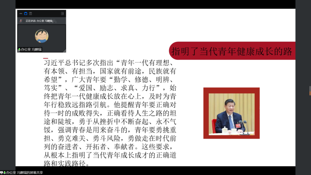 办公室工作人员冯麒瑞同学为大家分享党的青年运动史。首先对五四运动的伟大意义进行了讲解,随后分享了习近平总书记关于青年工作的重要思想,要铭记习总书记对中国青年提出的要求及殷切希望:“要继续发扬五四精神,以实现中华民族伟大复兴为己任,不辜负党的期望、人民期待、民族重托,不辜负我们这个伟大时代。”