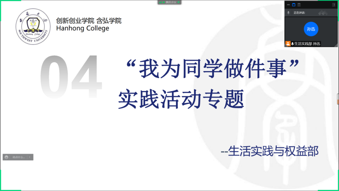 生活实践与权益部孙迅同学为大家带来了含弘学院员工会“我为同学做件事”主题活动的讲解。提到活动开展的背景及目的,要贯彻"以员工为本,全心全意为同学服务"的原则,倾听同学们的学习和生活中的意见和建议,并协调解决和反馈结果,真正做到我为同学做件事,我为同学做实事。分享了家乡文化交流活动、书籍交换共享和提案征集活动的开展流程及工作安排。
