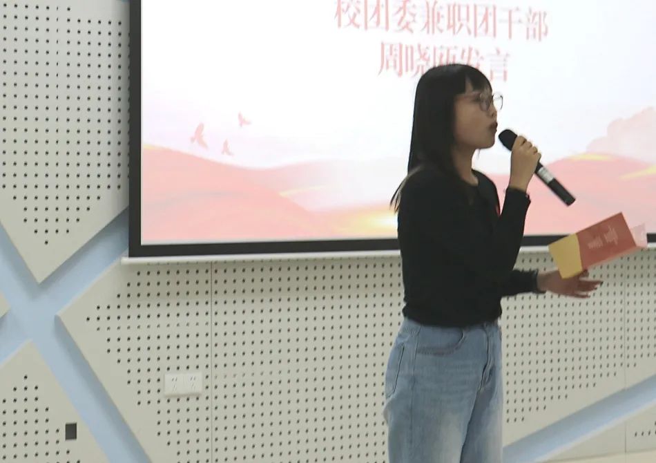 校团委宣传部李雨馨发表“百年青春荣光,领航逐梦时代”主题演讲。在李雨馨同志的导学下,全体师生了解从1916年陈独秀创办《新青年》,宣传“德先生”与“赛先生”的先进思想;到1918年毛泽东担任《湘江评论》的主编;及1919年五四运动爆发,1951年中央主流媒体《中国青年报》创刊;再到“一二·九运动”掀起全国革命高潮等中国百年的革新路程。李雨馨同志指出,唯有青春热血才能冲破梦魇,强大祖国。青春是一场旅行,有了梦想便义无反顾,让青春与祖国同在,让脉搏与祖国同振。作为时代新青年,我们要常怀感恩之心,长存忧患之思;又要永葆革命精神,永葆进取之志:让理想主义成为血脉基因,让理论素养成为看家本领、让从严从实成为鲜明特点、让自信自强成为青春底色。