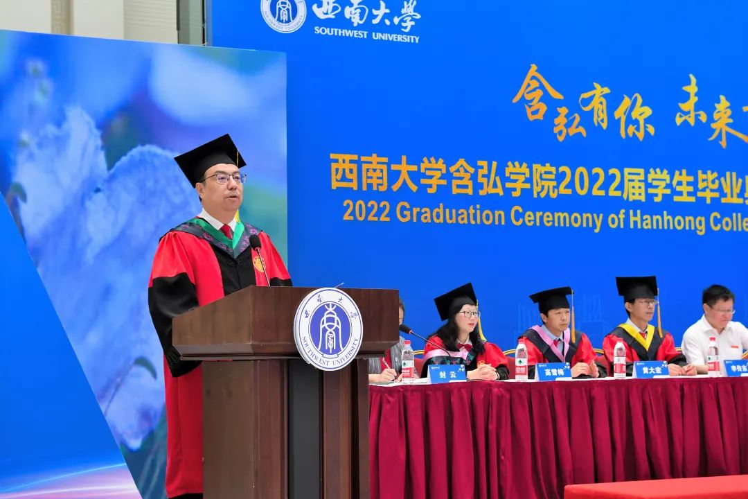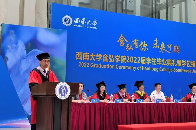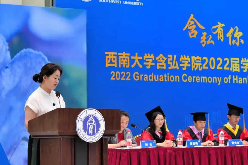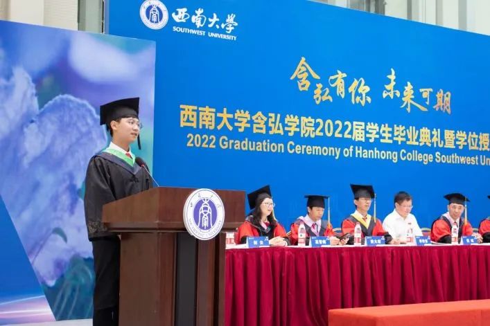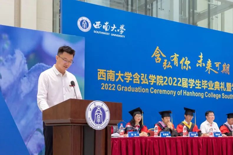 2018级神农班曾海越代表毕业生发言。曾海越表达了自己对农学的热爱,结合四年奋斗的足迹,倡导大家牢记袁隆平院士“心在最高处、根在最深处”的期望和嘱托,将个体的“小我”融入祖国和人民的“大我”,在人生每一个阶段赓续奋斗,遇见更好的自己。员工代表,即将赴牛津大学攻读博士学位的2015级袁隆平班黄子同学鼓励毕业生们终身学习,坚定目标,在未来继续为含弘学院增添荣耀。教师代表2018级吴宓班班主任、含弘学院学业导师、国家治理学院副教授汪艳霞老师围绕三个关键词“勤奋、前进、选择”对员工四年的成长进行总结,她希望大家胸怀感恩之心,感恩党和国家,感恩社会和人民,沿自己的道路坚定不移的走下去。