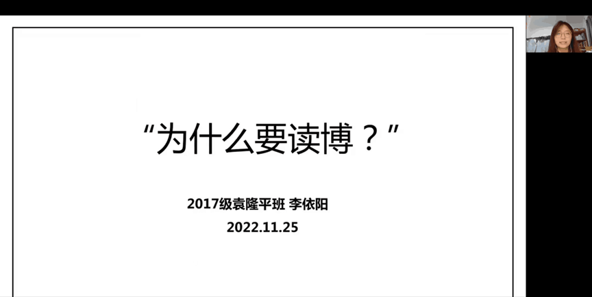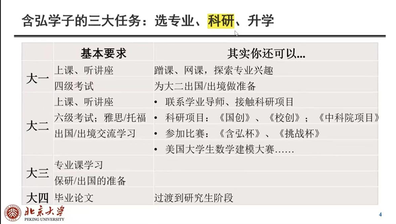 没有规划的人生叫拼图,有规划的人生叫蓝图;没有目标的人生叫流浪,有目标的人生叫航行!刚进入含弘学院不久的新生们,对于如何规划自己的老员工活仍然存在着许多困惑。对此,2017级李依阳学姐从宏观上指出新生们在大一大二阶段需要重视通识课的学习,打好学科基础。现在北京大学就读博士的周意勇学姐以含弘学子的三大任务为横轴,大学四年时光为纵轴,为学弟学妹们提出了更多的发展路径:不仅可以通过多听课的方式探索自己的专业兴趣,还可以通过旁听研究生组会、参与老师的科研项目来更加直观地了解专业,训练自己的科研能力。而对于怎样做规划,2018级邓越学姐则建议新生们分别确立短期和长期目标,明确每个阶段的侧重点,学会多线程开展学习和工作。