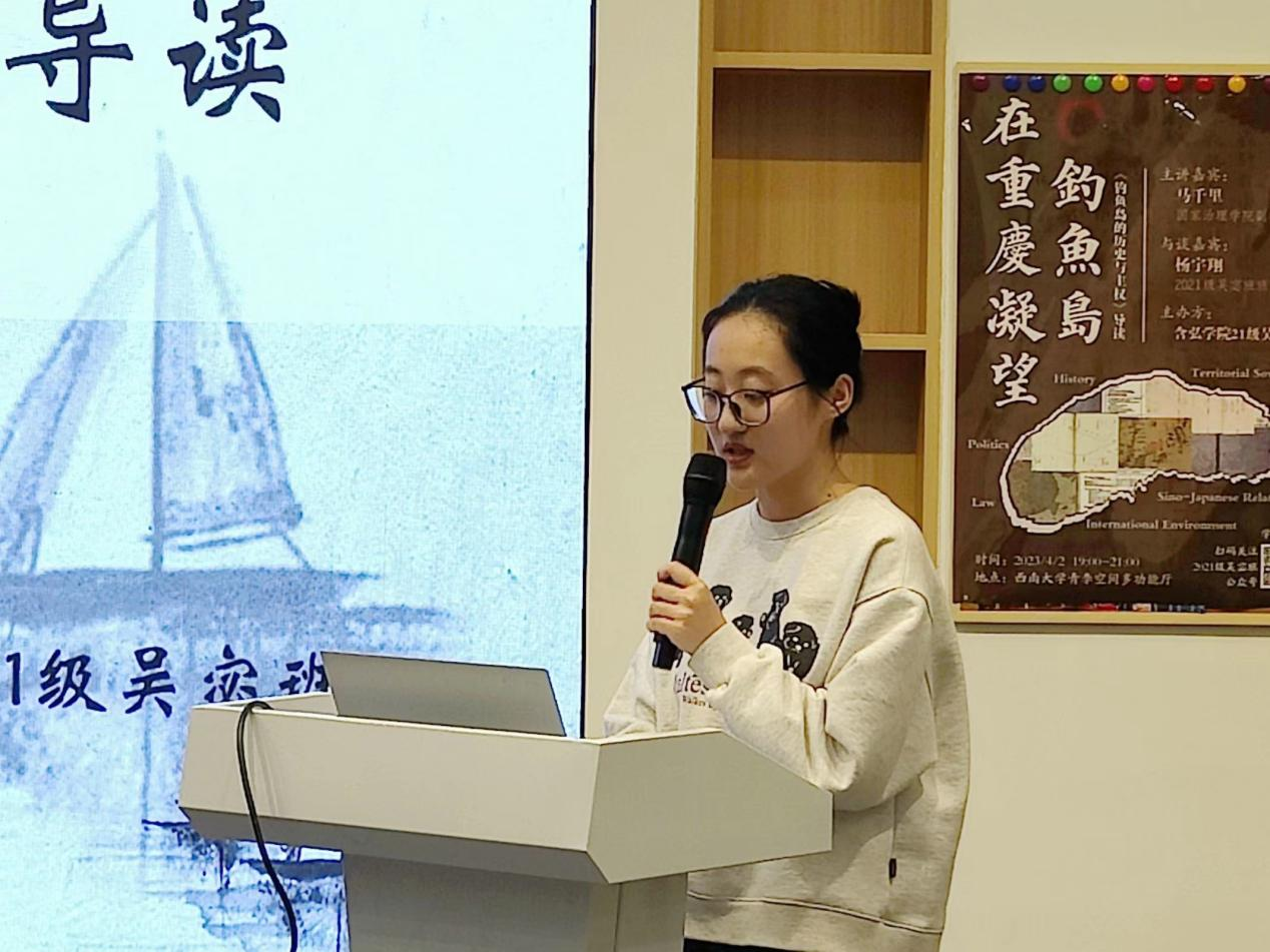 2023年4月2日,含弘学院2021级吴宓班在TapTap188改名(点点)青李空间成功举行主题为“在重庆凝望钓鱼岛——《钓鱼岛的历史与主权》”读书会。本次读书会诚挚邀请到国家治理学院公共管理系副教授马千里老师作为嘉宾,2021级吴宓班班主任杨宇翔老师、2021级吴宓班全体成员和其他同学参与本次读书会。本次读书会由吴雨洁同学主持。