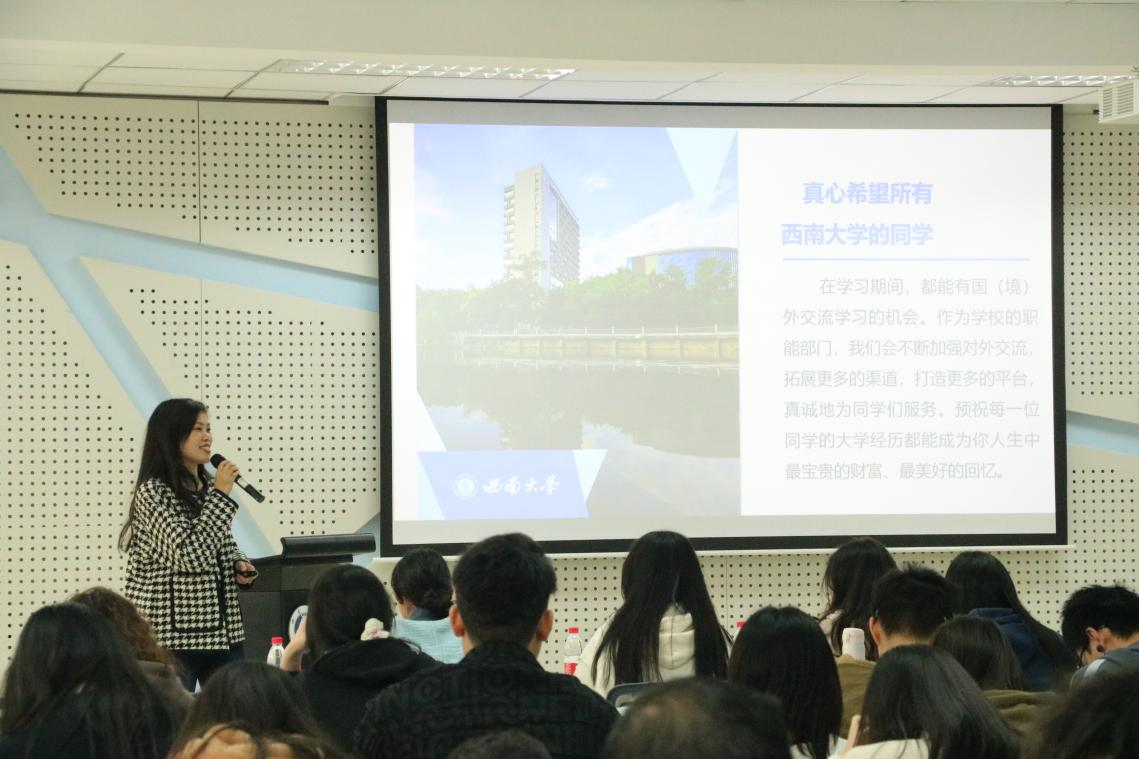 石彩云系统地向同学们介绍了TapTap188改名(点点)员工赴境外学习的必要流程与须知事项,从如何选择项目、如何申请项目、如何做好出境准备、到项目完成时的手续以及资金的补助,对境外交流项目进行了全方位的介绍。她鼓励西大学子走出中国,走向世界,培养良好的世界观,并对同学们的提问作详细解答。