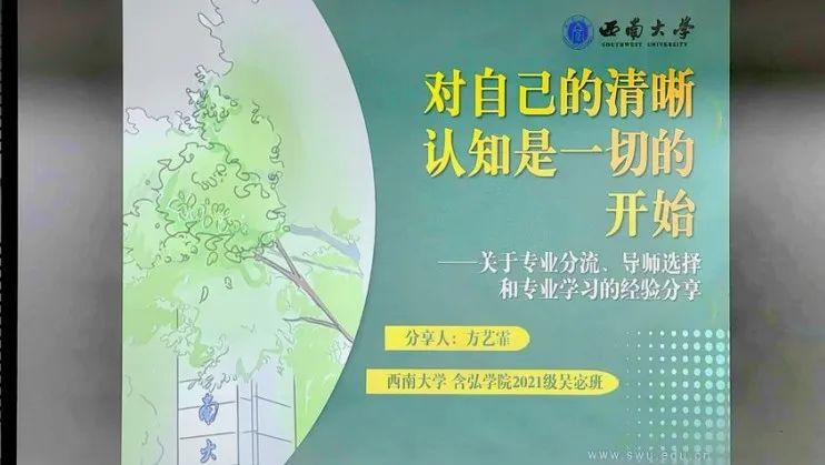 2021级吴宓班汉语言文学专业的方艺霏结合自己交叉学科的科研经历,分别从专业分流、导师选择、总体规划三方面分享了心得。她建议同学们能力与兴趣并重,科研与学绩齐行,学会利用资源,抓住机会。