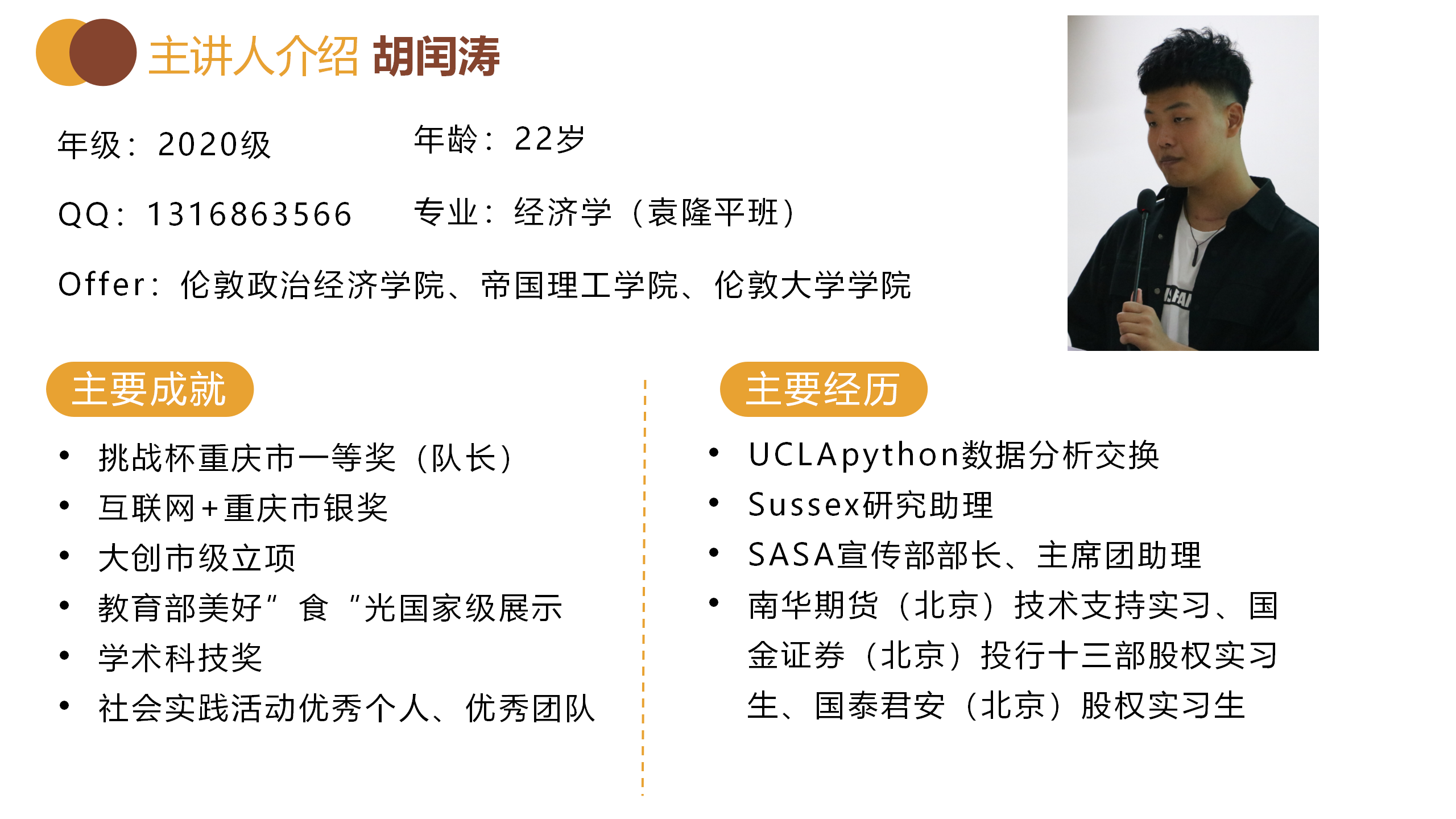 用脚丈量世界,出发永远是最有意义的事情。成功获得多所世界名校offer的胡闰涛围绕留学院校的选择与文书材料的准备与同学们进行了交流,他建议2021级的同学们要注重语言成绩的提升并广泛参与实习实践,以此丰富申请履历。