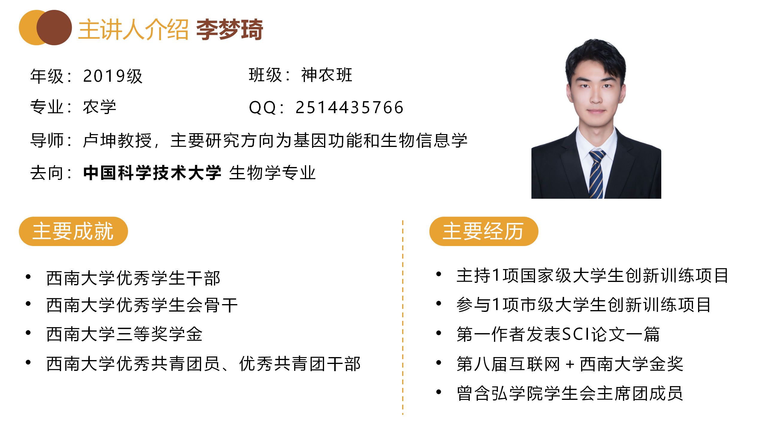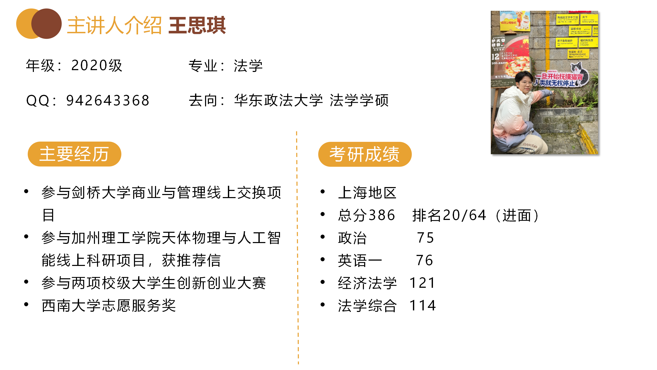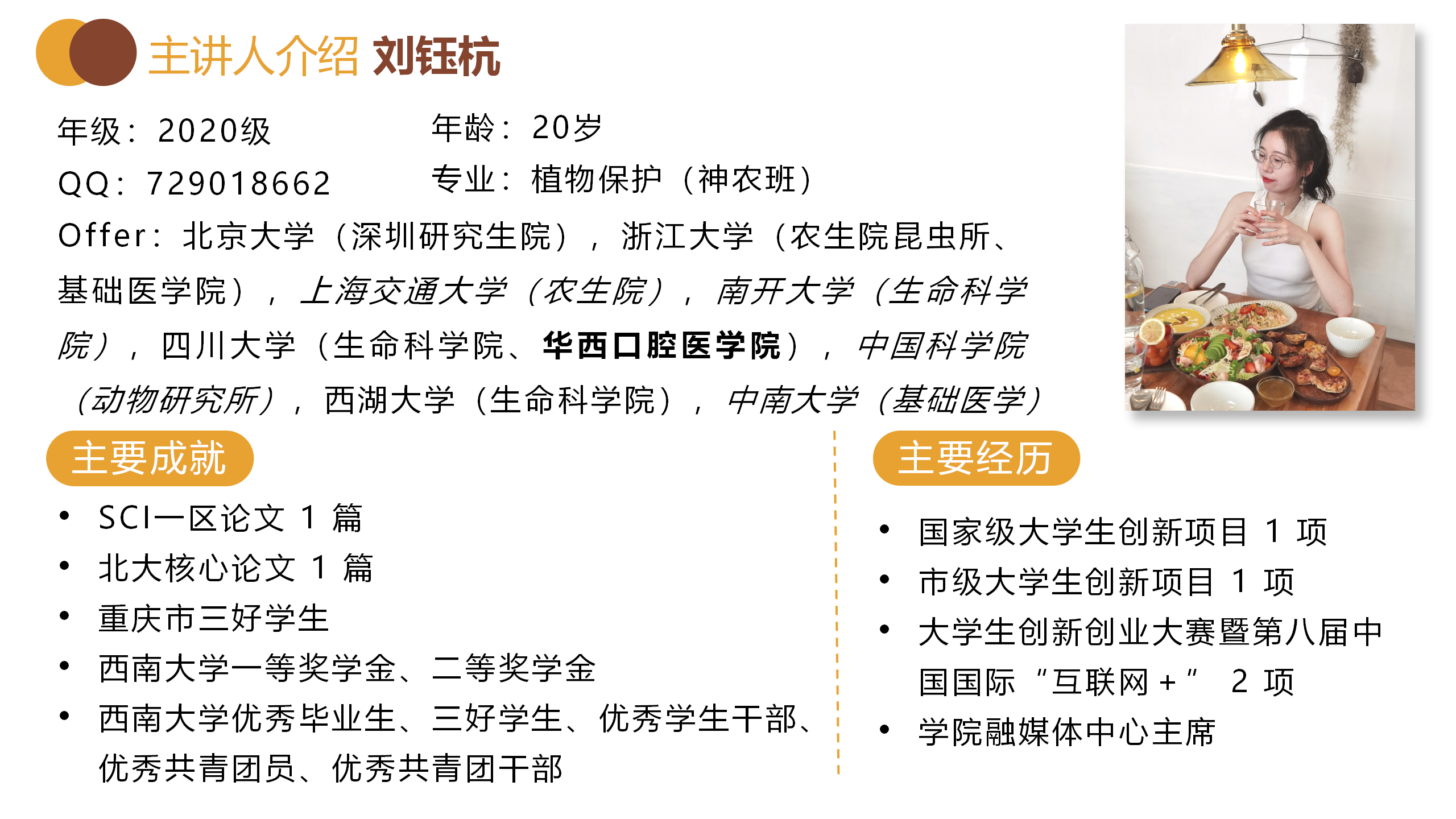 博观约取,厚积薄发。斩获多所名校offer,最终跨保至四川大学华西口腔医学院的刘钰杭围绕保研时间线,从准备材料、入营表现技巧、时间分配等方面针对性地解答了2021级学子的疑惑。