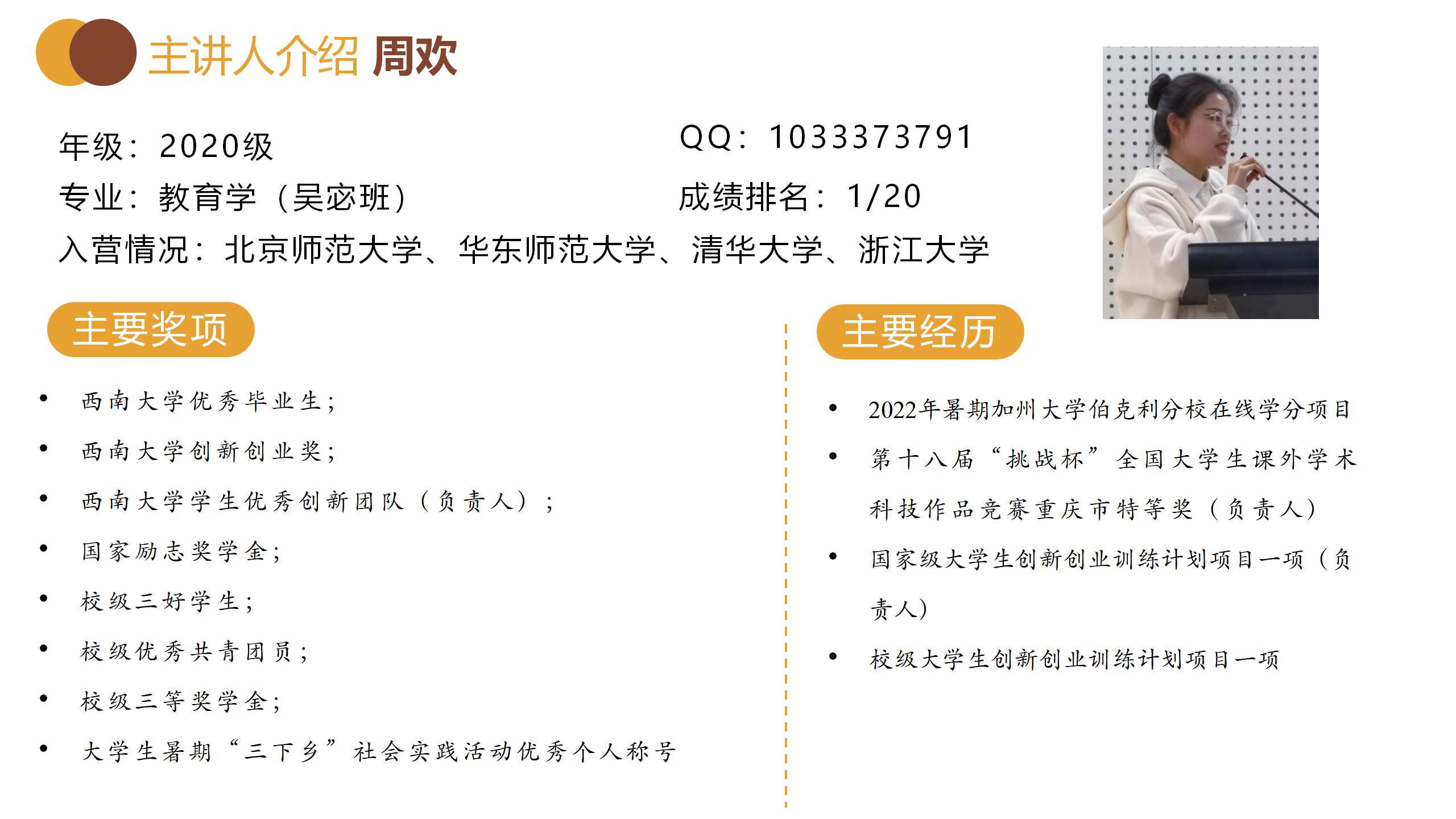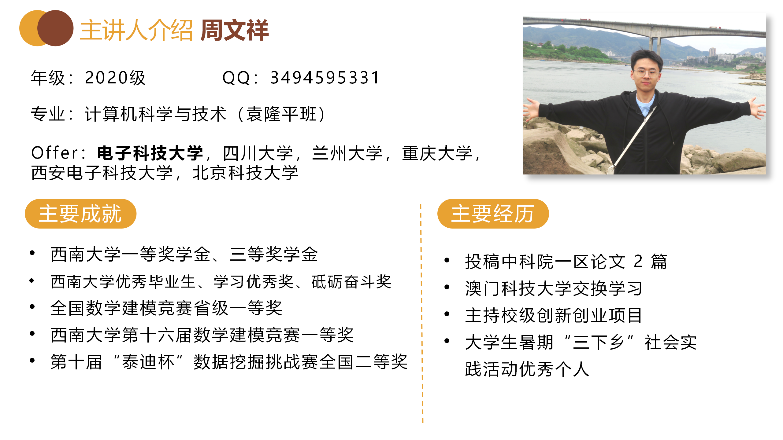 计算机科学与技术专业的周文祥强调了竞赛和刷题的重要性,在丰富的入营经历中,他透彻分析了自身的竞争优势与劣势并鼓励同学们广泛入营、勇于探索。