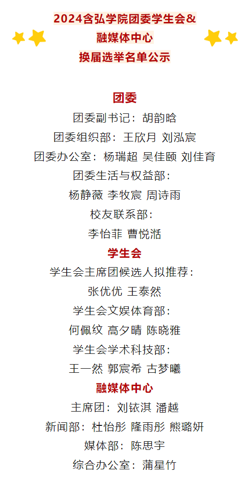 至此,含弘学院团委员工会&融媒体中心2023-2024学年度述职评议大会圆满结束。随后,含弘学院团委员工会&融媒体中心分别进行了换届选举,确定换届名单,公示如下。