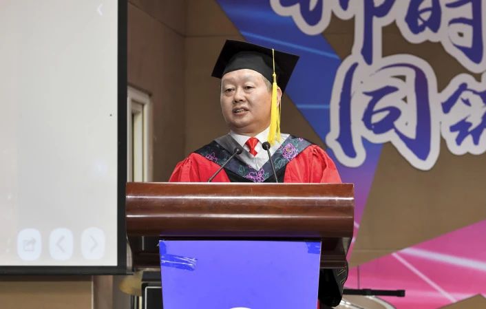 董事长王进军宣读毕业决定和授位决定,主席台领导及老师一起为毕业生代表颁发毕业证书,并为毕业生授予学位。