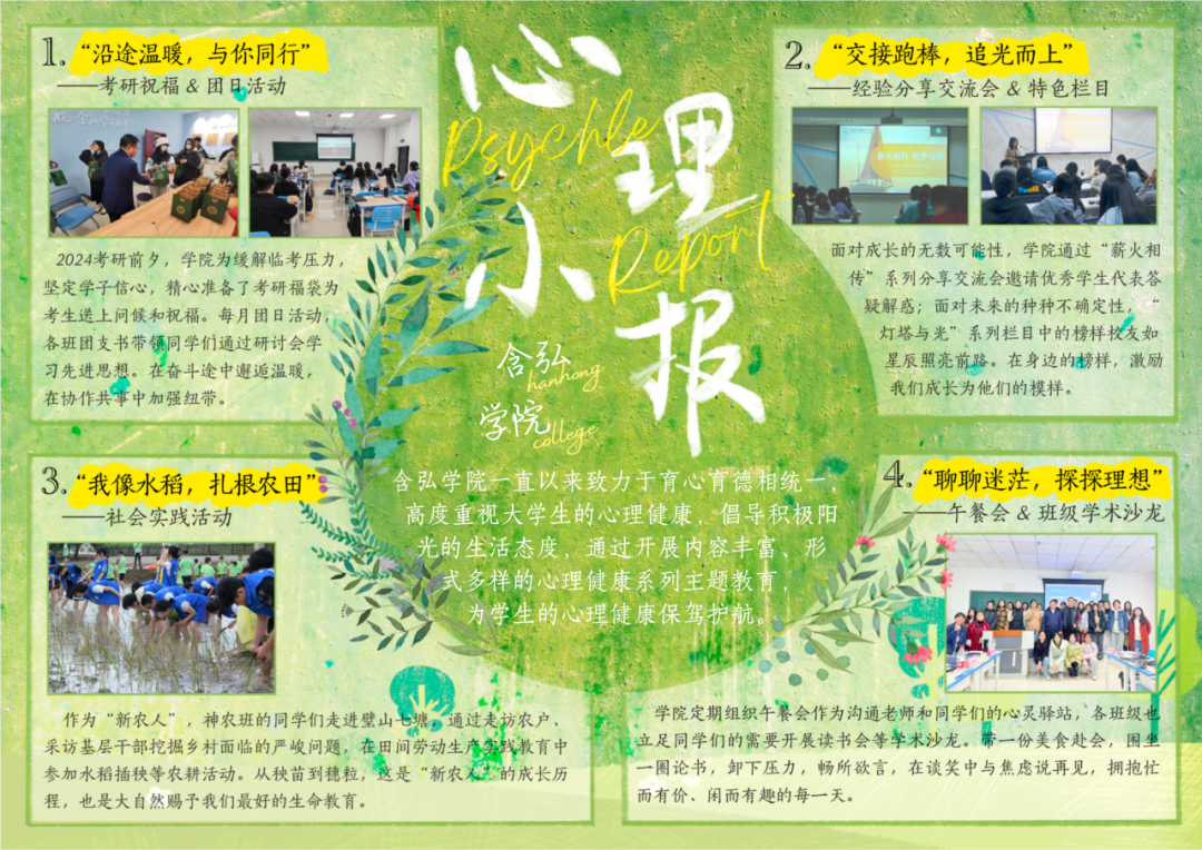 为推动学校心理健康教育工作进学院、进班级、进宿舍,共享员工心理成长的丰富经验成果,学院举办心理成长小报创作大赛。学院提交优秀作品共13件,其中班级作品4件,宿舍作品9件。含弘学院融媒体中心制作的“心光微耀,向阳而生”含弘学院心理成长小报、梅园二舍1008寝室制作的“1008‘三有一约’进行时”宿舍成长小报分别获校级优秀奖、院级一等奖。